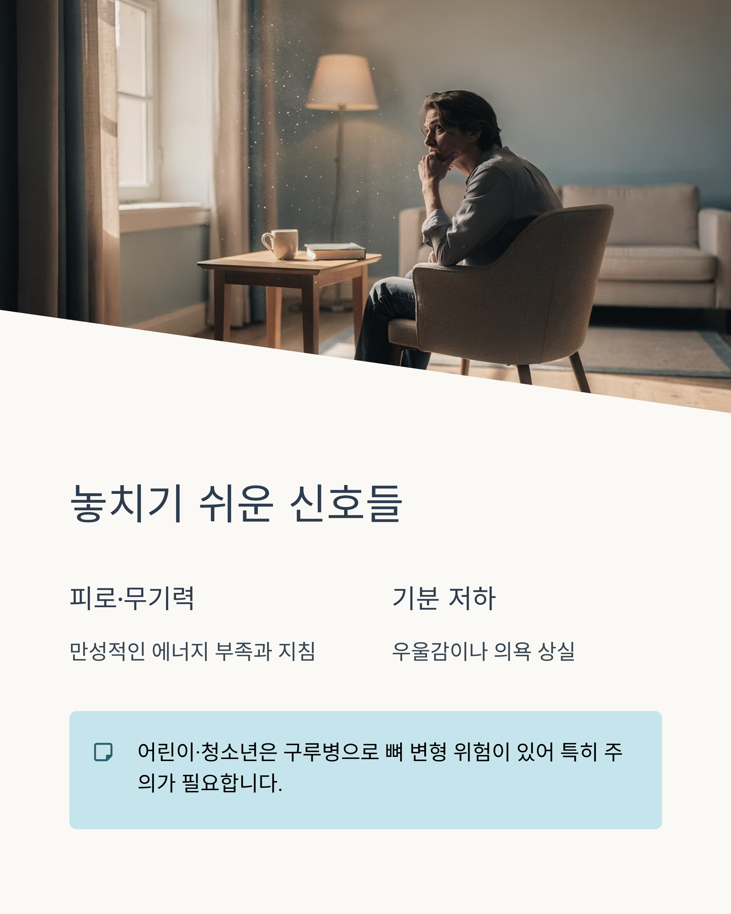 칼슘·비타민 D 결핍이 지속되면 뼈가 더 취약해져 골절 위험이 증가할 수 있다는 설명이 있습니다. - 피로감·무기력, 기분 저하 (우울감)
