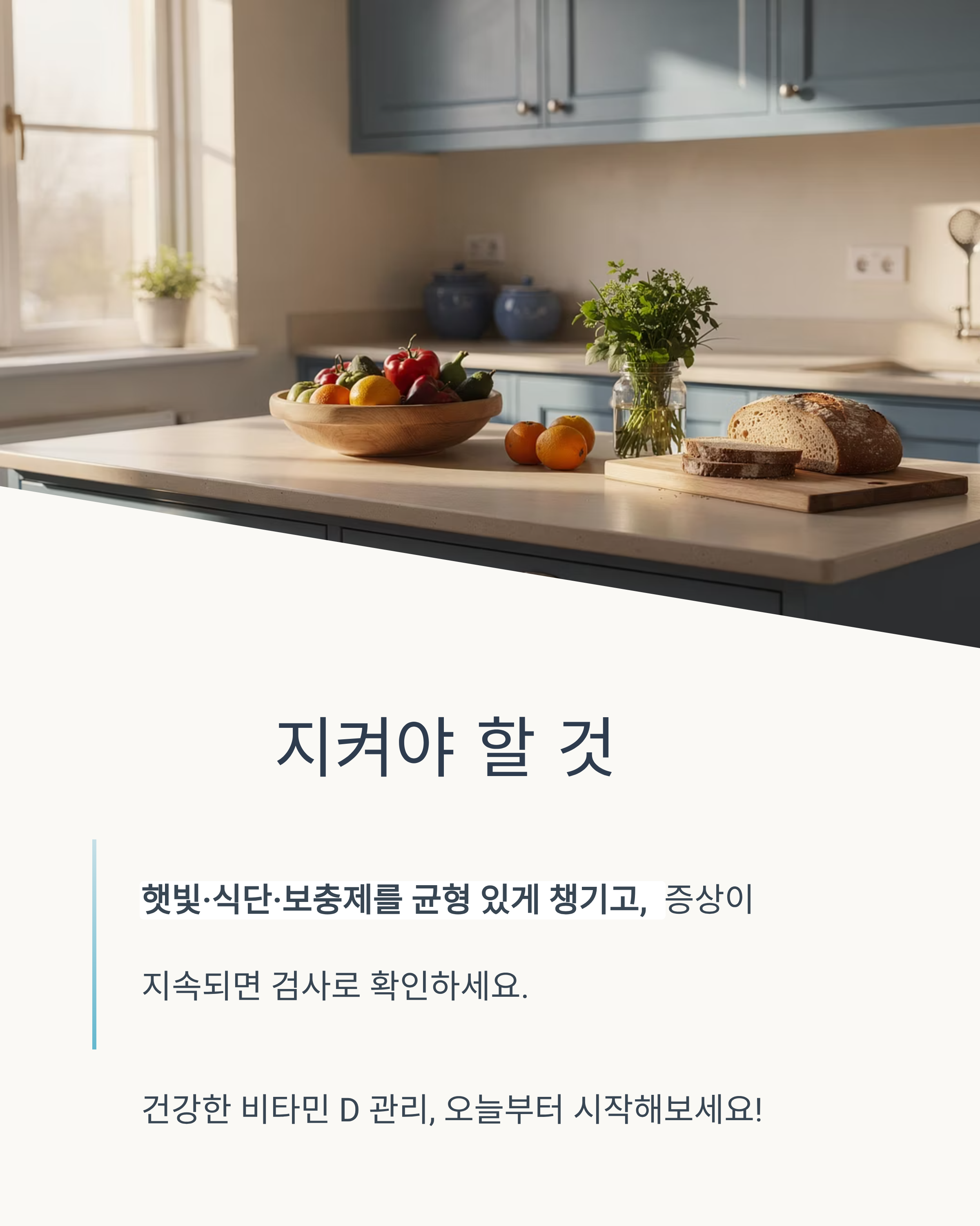 피부가 햇빛(자외선)을 받을 때 비타민 D가 합성됩니다. 화상은 피하고, 내 피부 타입/계절을 고려해 무리하지 않는 루틴을 잡아보세요. - 식단 업그레이드