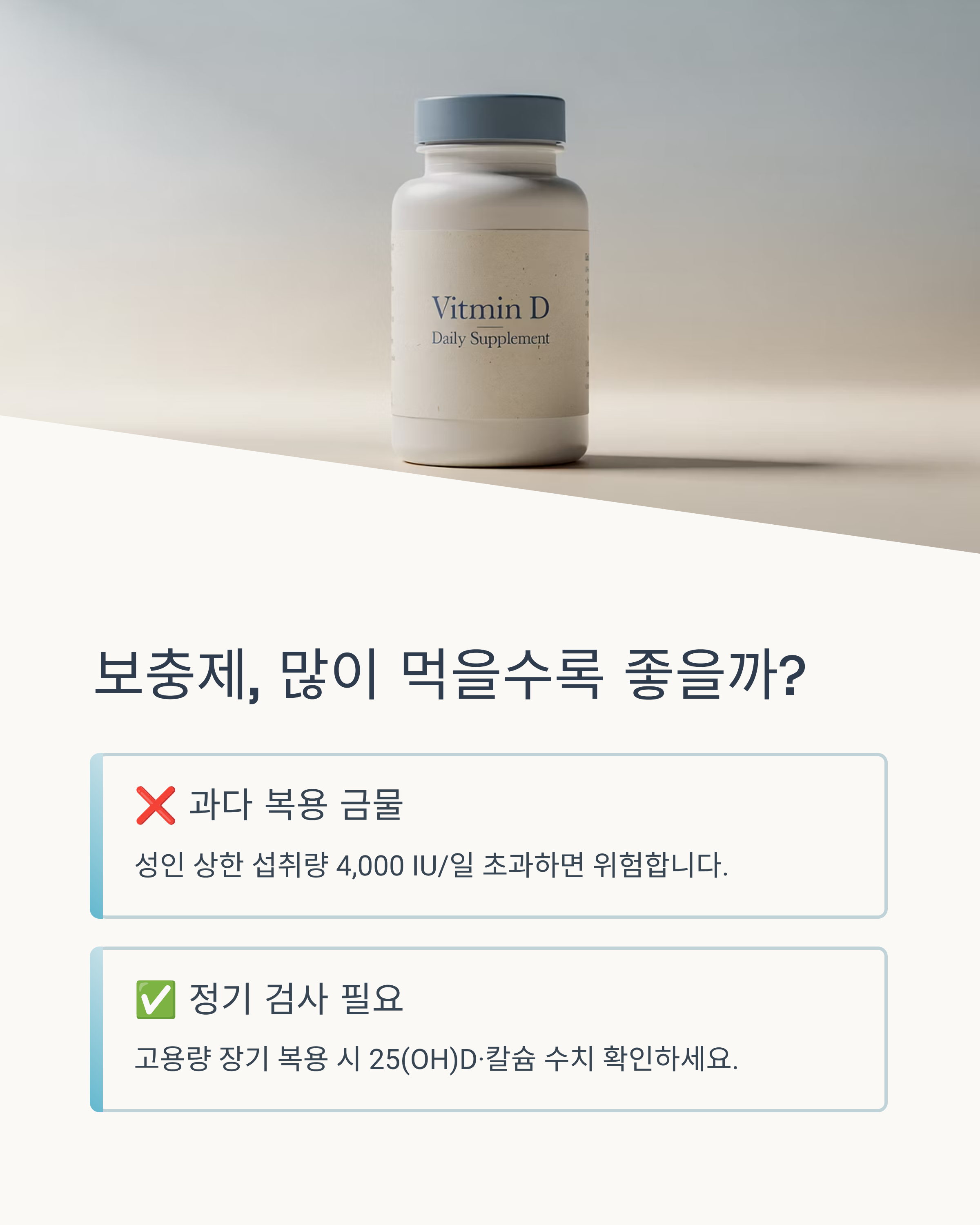 "상한선(4,000 IU/일)"을 넘는 장기 복용은 피하고 증상이 지속되면 검사로 확인해 보세요.