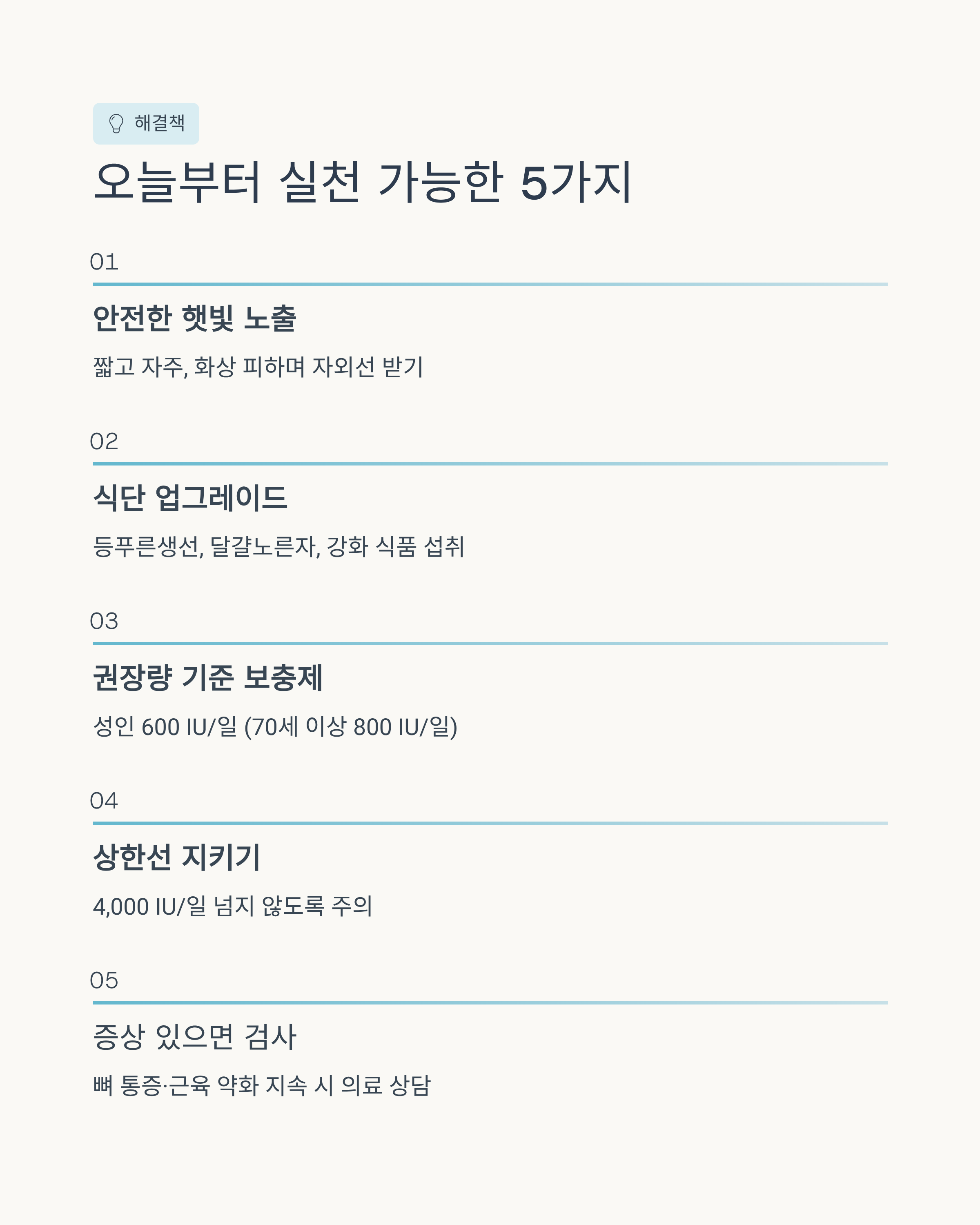 뼈 통증·근육 약화가 뚜렷하거나, 골절이 잦거나, 만성질환/흡수장애가 있다면 “일단 보충제”보다 검사를 통해 맞춤 용량을 정하는 편이 좋아요.